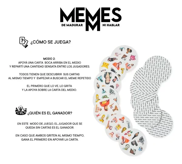 ¿Qué mejor plan para una tarde de lluvia que un juego de mesa? Con el Memmes vas a crear divertidos recuerdos y pasar momentos inolvidables junto a tus amigos y amigas. Con este pasatiempo entretenido las risas están aseguradas.
