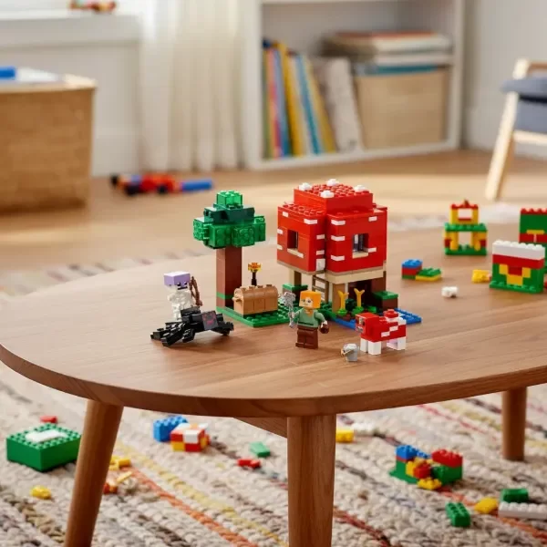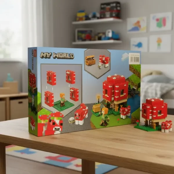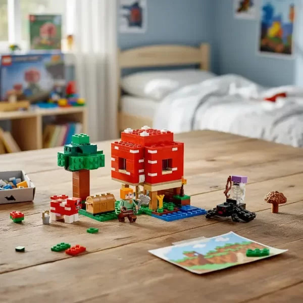 Incluye 292 piezas para construir una casa tipo hongo con animales, personajes y accesorios, recreando aventuras del mundo Minecraft.