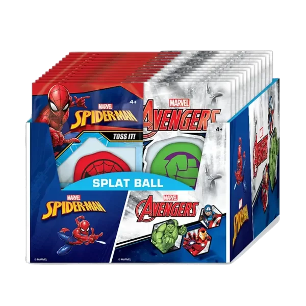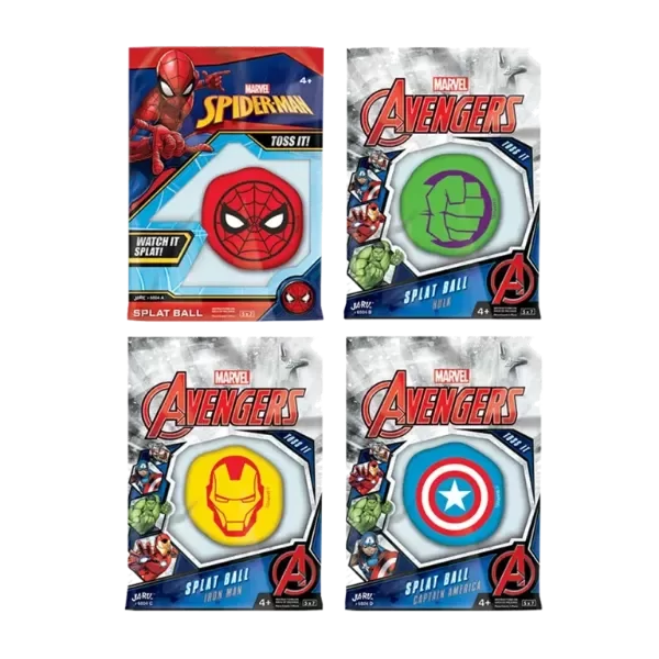 BOLAS INDIVIDUALMENTE ENVASADAS ALEATORIAS SURTIDAS DE LAS BOLAS ORIGINALES AVENGERS SPLAT. Surtido en 4 estilos: Spiderman, Hulk, Capitán América y Iron Man. Bolas pegajosas, bolas esponjosas, bolas de estrés. ¡Tíralo! ¡Mira cómo se pega! ¡Tira y salpica!