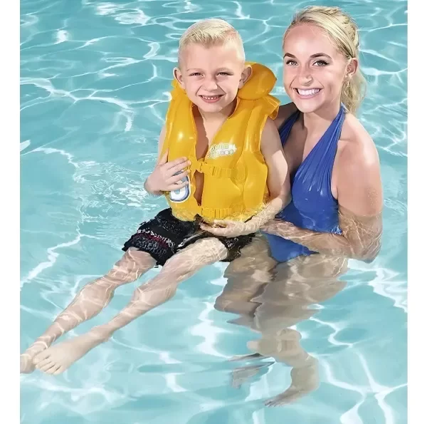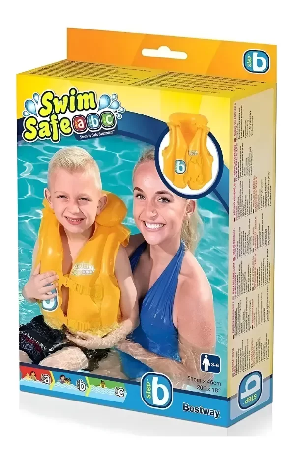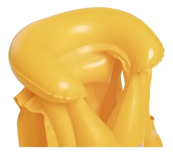 Chaleco salvavidas inflable para pileta en color amarillo. Ideal para que los niños aprendan las nociones básicas de natación y de seguridad en la piscina. Este chaleco salvavidas cuenta con 3 cámaras de aire y un collarín inflable para mayor flotabilidad, proporcionando un alto nivel de seguridad. Además, tiene 2 hebillas ajustables de fácil apertura que permiten un ajuste seguro y cómodo. Las imágenes son a modo ilustrativo.