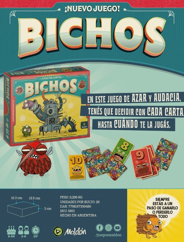 Bichos es un juego de AZAR y AUDACIA. Tenés que decidir con cada carta hasta cúando te la jugás. Un juego donde deberás controlar los impulsos de seguir y frenar a tiempo. ¿Hasta donde sos capaz de empujar tu suerte?