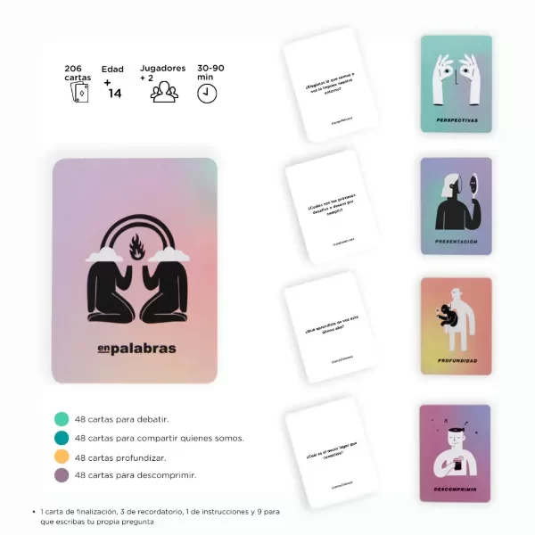 Las cartas están divididas en cuatro secciones, cada una pensada para activar diferentes emociones y tipos de conversación: