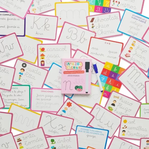 • Contiene todo el abecedario, ejemplos de palabras, oraciones para practicar y además un marcador con borrador.