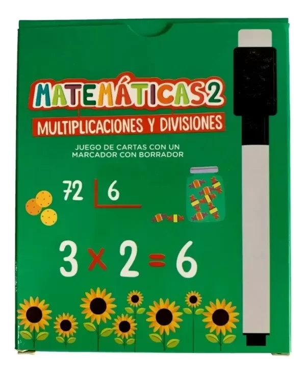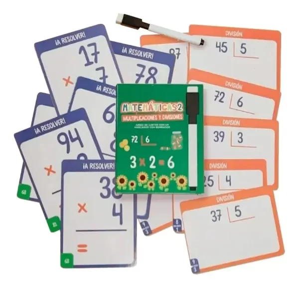 • Las cartas contienen multiplicaciones y divisiones e incluyen diferentes juegos y problemas para resolver.