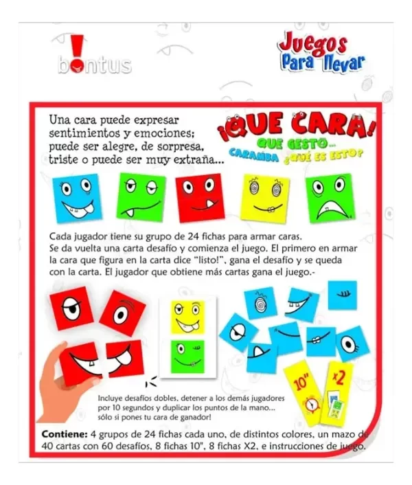 Contiene: 4 grupos de 24 fichas cada uno, de distintos colores, un mazo de 40 cartas con 60 desafíos, 8 fichas de 10", 8 fichas X 2, e instrucciones de juego.