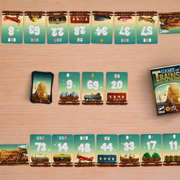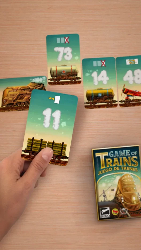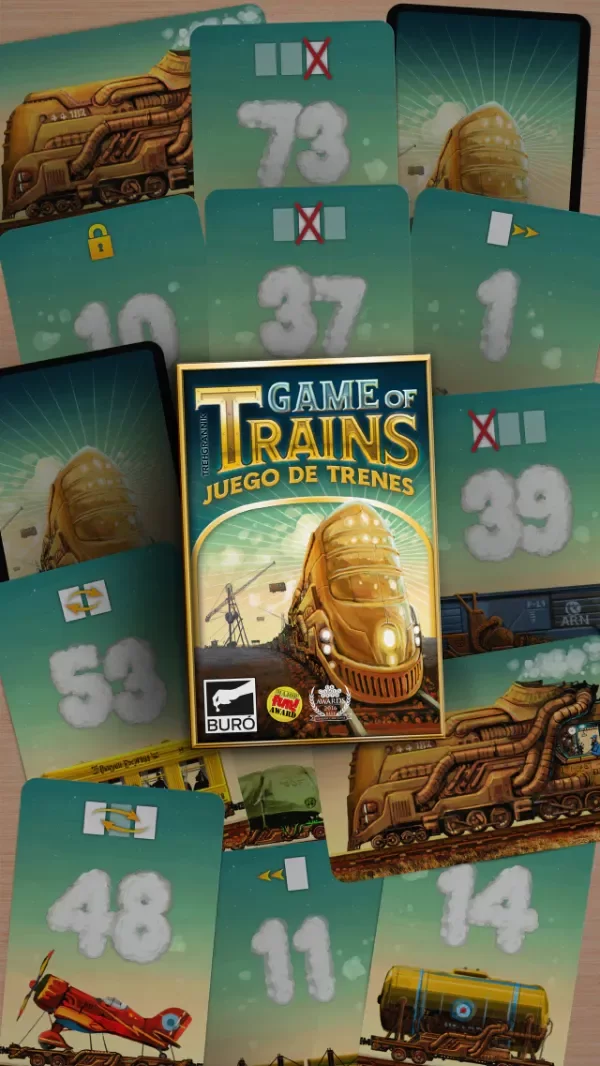 GAME OF TRAINS JUEGO DE MESA CARTAS BURÓ Game of Trains es un juego rápido en el que eres un maquinista que intenta ser el primero en reordenar las cartas de vagón que están de mayor a menor para pasarlas de menor a mayor. Cada carta de vagón tiene un número y una habilidad. En tu turno tienes dos opciones: robar una carta del mazo para reemplazar cualquier vagón de tu formación o usar una habilidad especial para alterar el orden de tu tren. Hay 8 habilidades diferentes para ayudarte o complicar a los demás. ¡Sube al andén y no dejes pasar el tren! Contenido: • 88 Cartas • Reglamento Recomendado de 2 a 4 jugadores a partir de 8 años. Tiempo de juego 20 minutos.