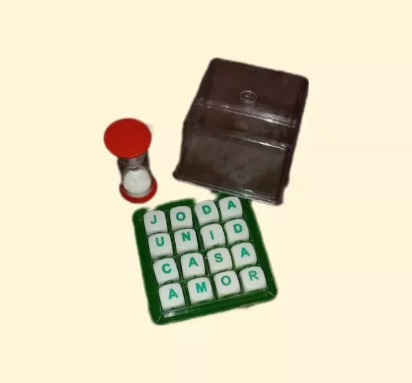 Contenido: 1 base reticulada 16 casilleros con tapa plástica, 16 dados con letras impresas en todas sus caras y 1 reloj de arena.