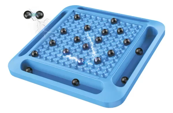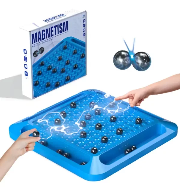 Los jugadores se turnan para colocar sus esferas magnéticas en cualquier espacio cóncavo del tablero y al hacerlo algunas se atraen entre sí. Deberás llevárselas y seguir jugando con todas ellas. Gana el primero en colocar todas sus esferas magnéticas sin que estas se unan entre sí.