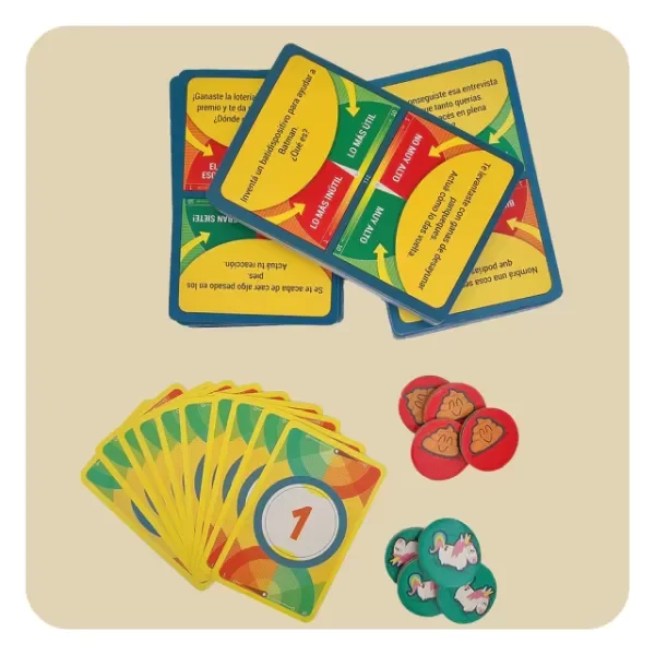 Para cada tema, cada jugador tiene que inventar una respuesta y decirla. Pero la intensidad de la respuesta debe corresponder a el número secreto que le haya tocado, del 1 (en verde) al 10 (en rojo). Entonces, si el CAPITAN pone las respuestas en el orden correcto, ¡el equipo gana!