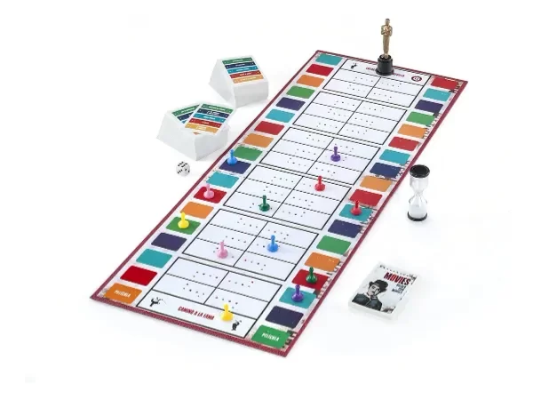 Contenido: 1 tablero, 12 peones plásticos, 1 dado, 242 tarjetas (con 1210 títulos de películas y series), 1 reloj de arena, 1 estatuilla, 1 reglamento.