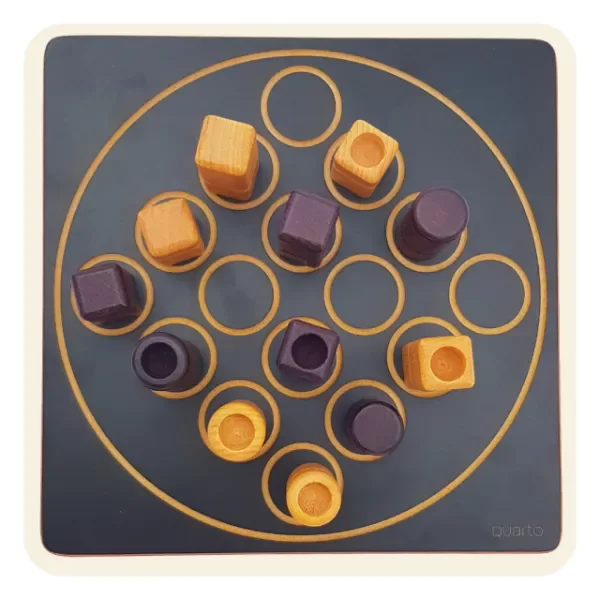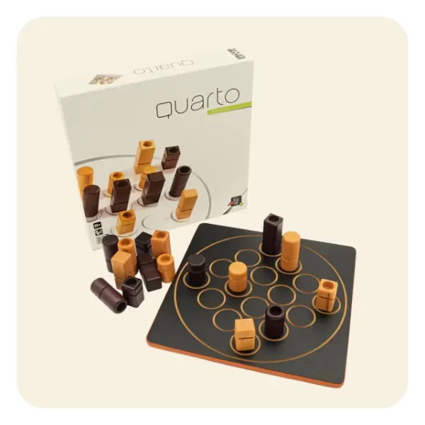 El Quarto es un juego de mesa abstracto que ya es considerado un clásico. Las 16 piezas tienen 4 atributos distintos: altura (alta o baja), color (clara u oscura), forma (redonda o cuadrada) y relleno (liso o hueco). El objetivo del juego es alinear 4 piezas con una característica común. El problema es que uno no elige las piezas que va a jugar, ¡tu rival las elige por vos!