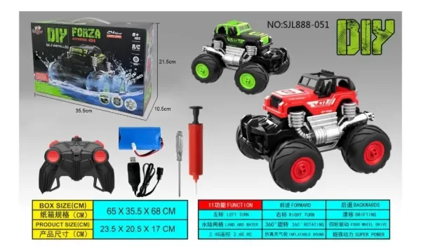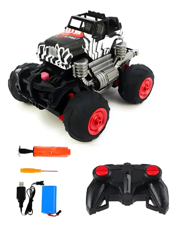 Auto radio control recargable con usb, el control funciona con 2 pilas AA (no incluidas). Gira 360° con ruedas inflables. Todo terreno, tierra y agua.