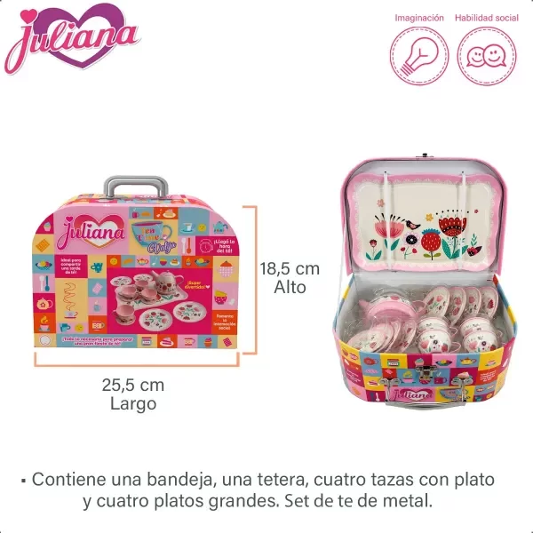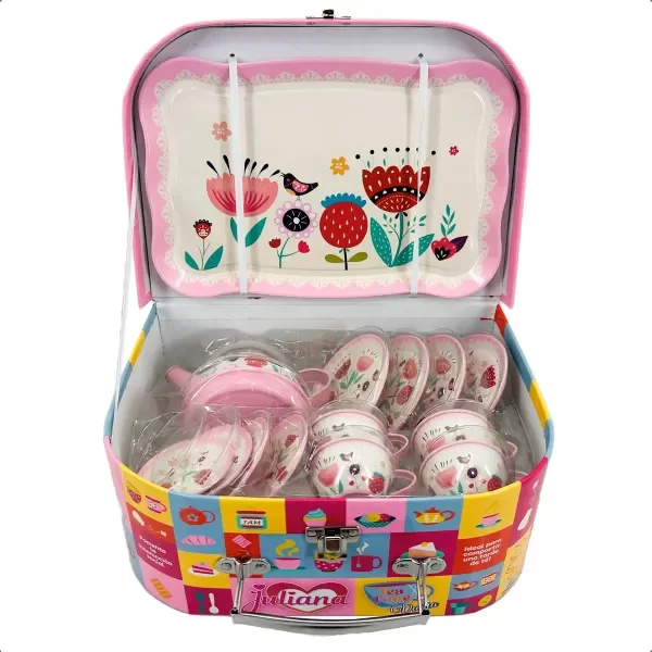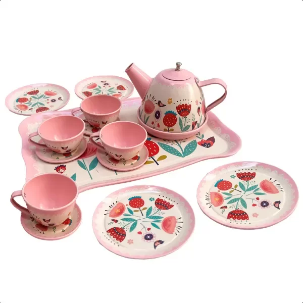 - Piezas de metal - Contiene 14 piezas: 1 bandeja, 1 tetera, 4 tazas, 4 platos grandes, 4 platos chicos