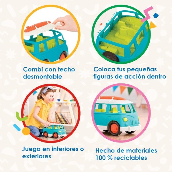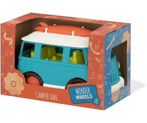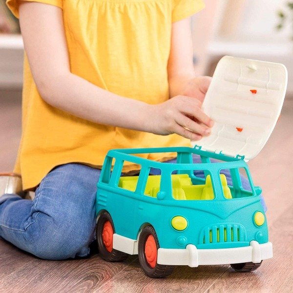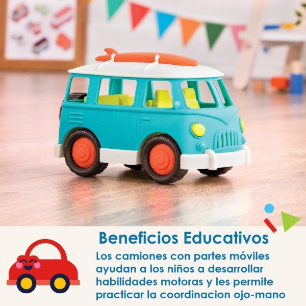 Vamos a surfear ahora, todos están aprendiendo cómo. ¡Prepárate para revivir días de verano sin preocupaciones con las maravillosas ruedas de la Combi Battat! A los niños les encantará empujar el camión de juguete por la sala de juegos tanto como la playa. El camión de juguete de estilo retro incluso tiene una tabla de surf en el techo para tu pequeño Surfer. La parte superior también se abre para que pueda ver y tocar el área de asientos espaciosa y detallada. Coloca tus pequeños juguetes de figuras de acción dentro y rodarán en Estilo. ¡El interior verde funky tiene detalles sorprendentes como un tablero de instrumentos, equipaje e incluso una pequeña cámara! ¡Hay una rueda de repuesto en la parte trasera y siempre hay mucho espacio para divertirse! Los vehículos y los coches de juguete Wonder wheels By Battat fomentan el juego de simulación, los juegos de rol y ayudan a mejorar las habilidades motoras finas. Recomendado para pequeños surfistas de 1 año en adelante.